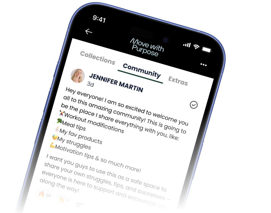 Inside the Move With Purpose community, you’ll find encouragement, accountability, and real-life support from women who are on the same journey. Share wins, ask questions, and stay motivated — together.